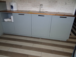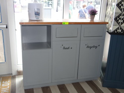 (1) Wood Beverage & Food Wall Station with Doors And Water Dispenser, 8' X 18" X 30" H#505 - (1) Wood Wall Mountd Trash/Recycling Receptacle 5'x19"x 4'H