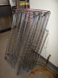 (1) Lot Metro Wire Shelving Accessories. (4) Shelves 4' X 2', (2) Green Shelves 18" X 42", (4) Posts 74" H#501 - (2) S/S Serving Food Shelves. (1) 10" X 78", (1) 10" X 62"