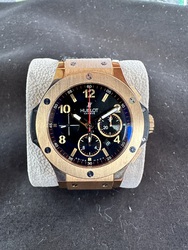 18K Gold Hublot Big Bang Style Wrist Watch on a Hublot Style Rubber Strap with an 18K Gold Folding Deployment Clasp. The Watch Features a Black Dial with a Chronograph and Date Function with Gold Sticks and Arabic Numerals. Model#: 301.M. Serial #: 609383.#491 - 18K Yellow Gold Rolex 36mm Day-Date Wristwatch with a Double-Quick Movement and an 18K Yellow Gold Folding Deployment Clasp Bracelet and Genuine 18K Yellow Gold Fluted Bezel. The Watch Features an Aftermarket Champagne Color Diamond Dial as well as Aftermarket Crystal. Model: 18238. SN: W956941.