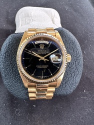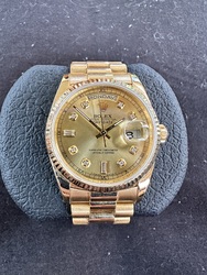 18K Yellow Gold Rolex 36mm Day-Date Wristwatch with a Double-Quick Movement and an 18K Yellow Gold Folding Deployment Clasp Bracelet and Genuine 18K Yellow Gold Fluted Bezel. The Watch Features an Aftermarket Champagne Color Diamond Dial as well as Aftermarket Crystal. Model: 18238. SN: W956941.#492 - 18K Yellow Gold Rolex Day Date 36mm Wristwatch with a Single Quick Movement and an 18K Yellow Gold Folding Deployment Clasp Bracelet. The Watch Features a Genuine Black Stick Dial. Model: #18038. Serial #: 8115306
