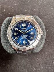 Stainless Steel 41mm Rolex Submariner Date Wristwatch. The Watch Features a Black Ceramic Bezel and a Black Dial with a Date Function. The Watch is Featured on an Oyster Style Folding Deployment Style Bracelet with Buckle. Model#: 126610. Seri a,#: 020927H1.#494 - Stainless Steel Breitling Superocean Wristwatch. The Watch Features a Blue Dial with Arabic Numbers and a Date Function. The Watch is Featured on a Stainless-Steel Breitling Pilot Style Folding Deployment Clasp Bracelet. Model #: A 17360. Serial#: 1202433.