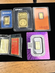 Group of Five Carded Gold Bars: (1) APMEX 1 Oz. .9999 Gold Bar Carded. (1) MOT LUONG 1.2057 Troy Oz. .9999 Gold Bar Carded. (1) Scottsdale Five Grams .9999 Gold Bar Carded. (1) Valcambi Suisse 2.5 Gram 999,9 Gold Bar Carded. (1) Sunshine Minting 5 Grams .9999 Gold Bar Carded. Total Weight Approx. 2.6 Troy Oz.#497 - Group of 14 K Gold Jewelry: (1) 14KYG Necklace 19" Long. Approx 21.7 DWT, (2) 14KYG Pendants w/Faux Diamonds. Approx. 19.8 DWT, (1) Gold Filled Ring w/Faux Diamonds. Total Gold Weight Approx. 41.6 DWT.