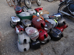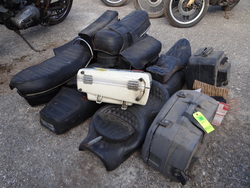 Group of (11) Motorcycle Seats along w/(4) Sidesaddles.#199 - Group of Pistons, Carburetors, Cylinders Barrels, Headlamp Shells, Chrome Exhaust Pipes, Fairings, Chopper Fork, etc.
