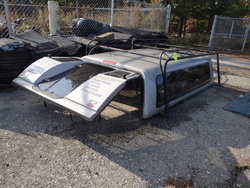 A.R.E. Truck Cap. Approx. 8'6" x 5'. w/Homemade Metal Rack.#231 - Contents of Container: Air Filters, Manifolds, Carburetors, Engine Stand w/383 Engine Block, Transmissions, Fenders, Bumpers, Cylinder Heads, Valve Covers, Car Seats, Brake Drums, etc. "Container Not Included".